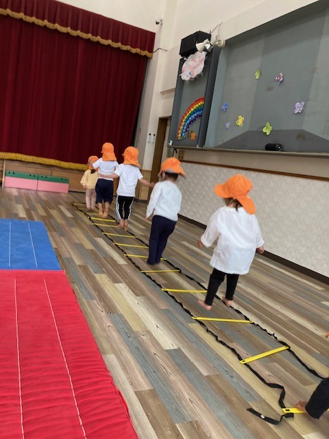 その後は、一列に並んでラダーという四角の中を歩きました。何度か歩くうちに、だんだんと一列に並ぶのが上手くなっていき、講師の先生も驚いていましたよ!