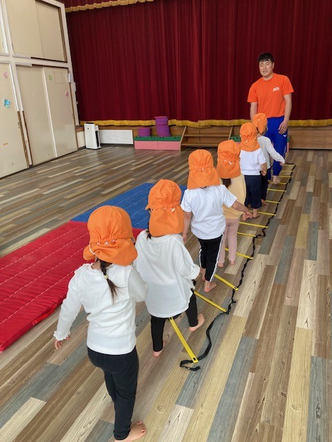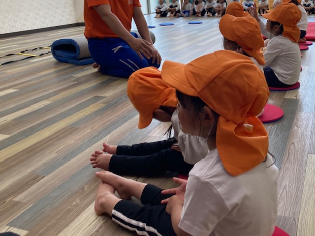 始まる前に体育指導の先生がお部屋に来てくれると「〇〇先生だー」と名前を覚えている子もいました!「早く始まらないの?」と楽しみにしていた子どもたち。
