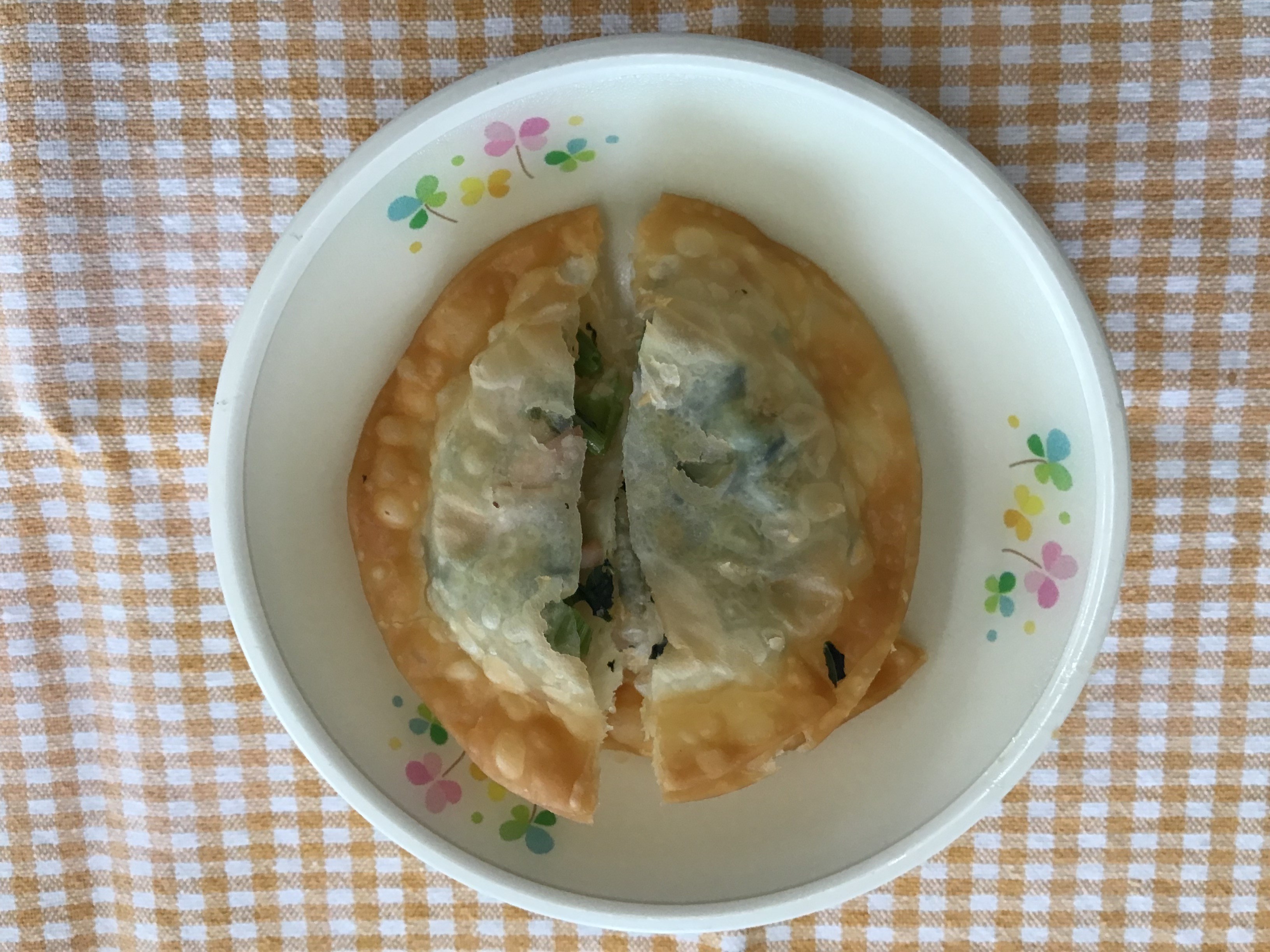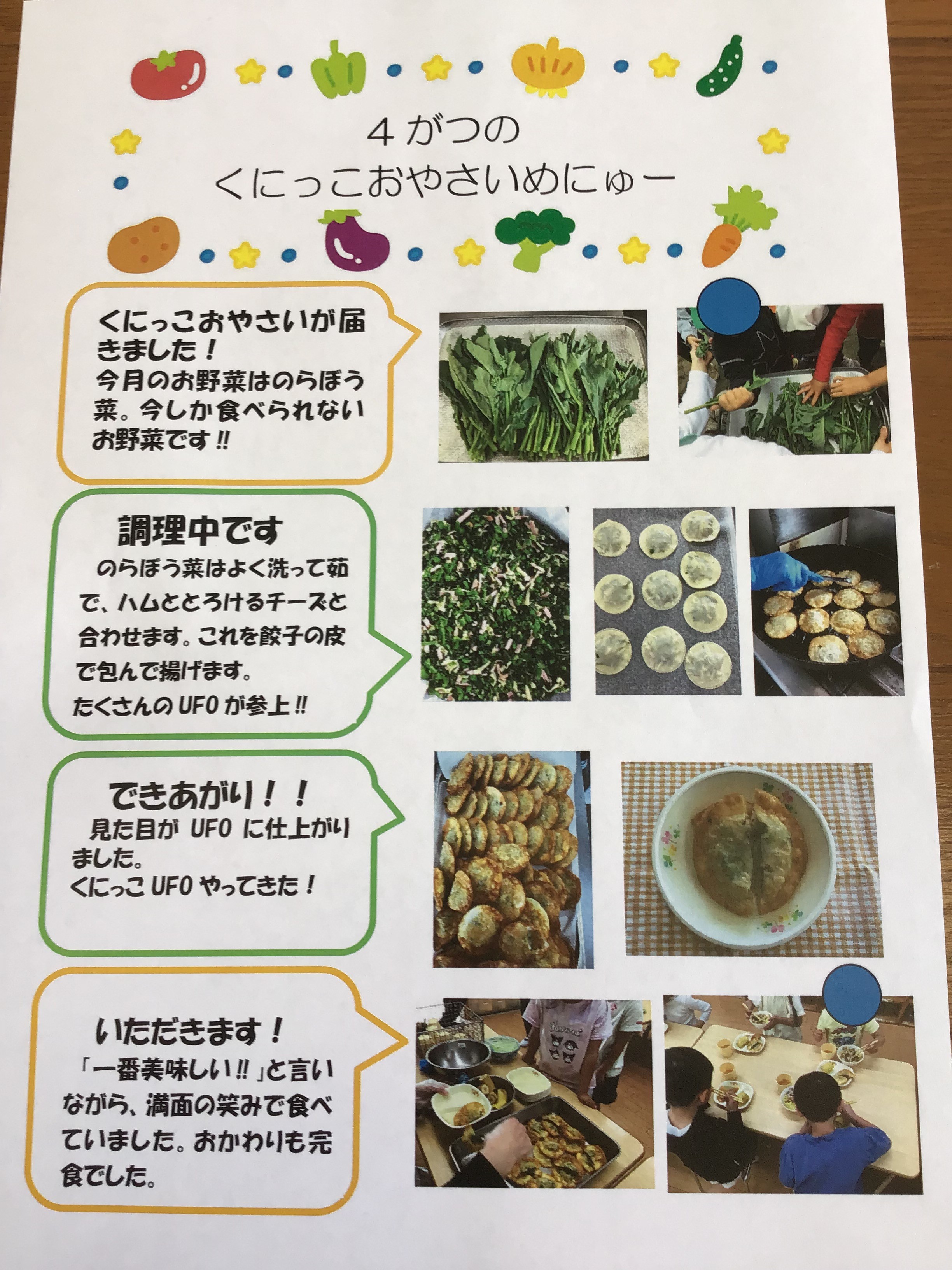 のらぼう菜を餃子の皮で包んであげました。 子どもたちも「美味しい」、「また食べたい」と、たくさんおかわりもしていました。 新鮮な野菜を届けてくださり、ありがとうございました。
