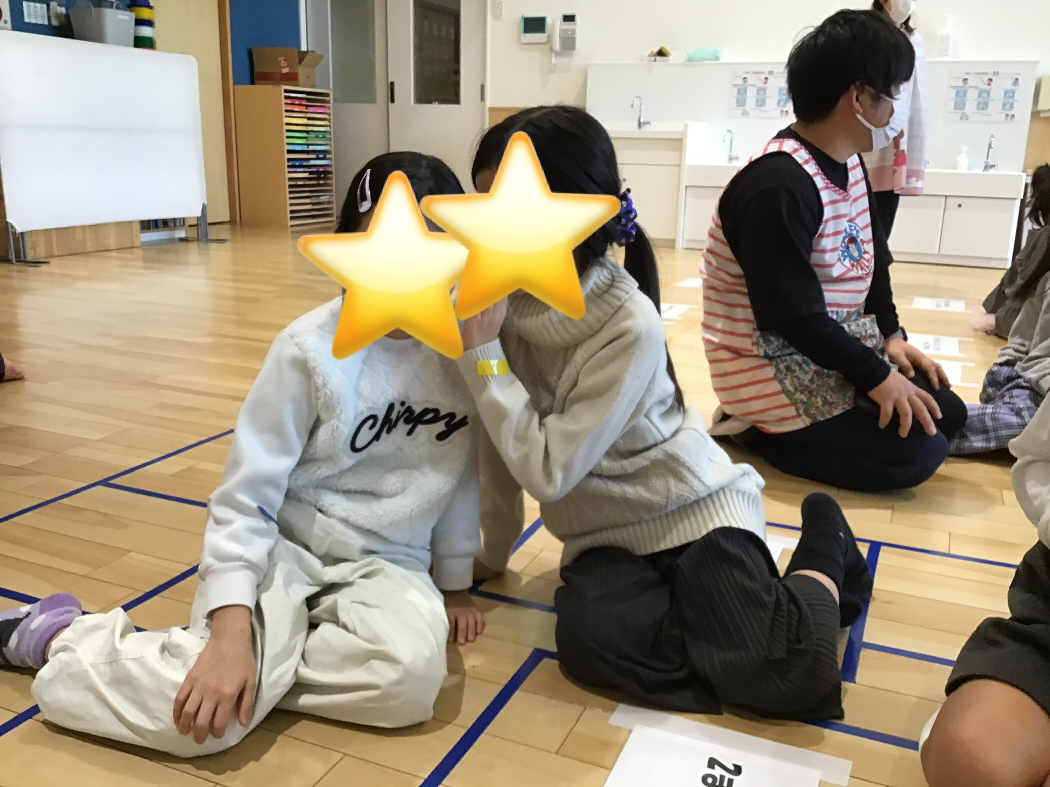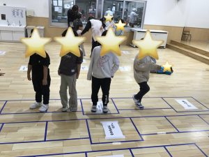 最初に各学年に分かれて伝言ゲームをおこない、1番後ろの友だちまで伝えている姿がありました。