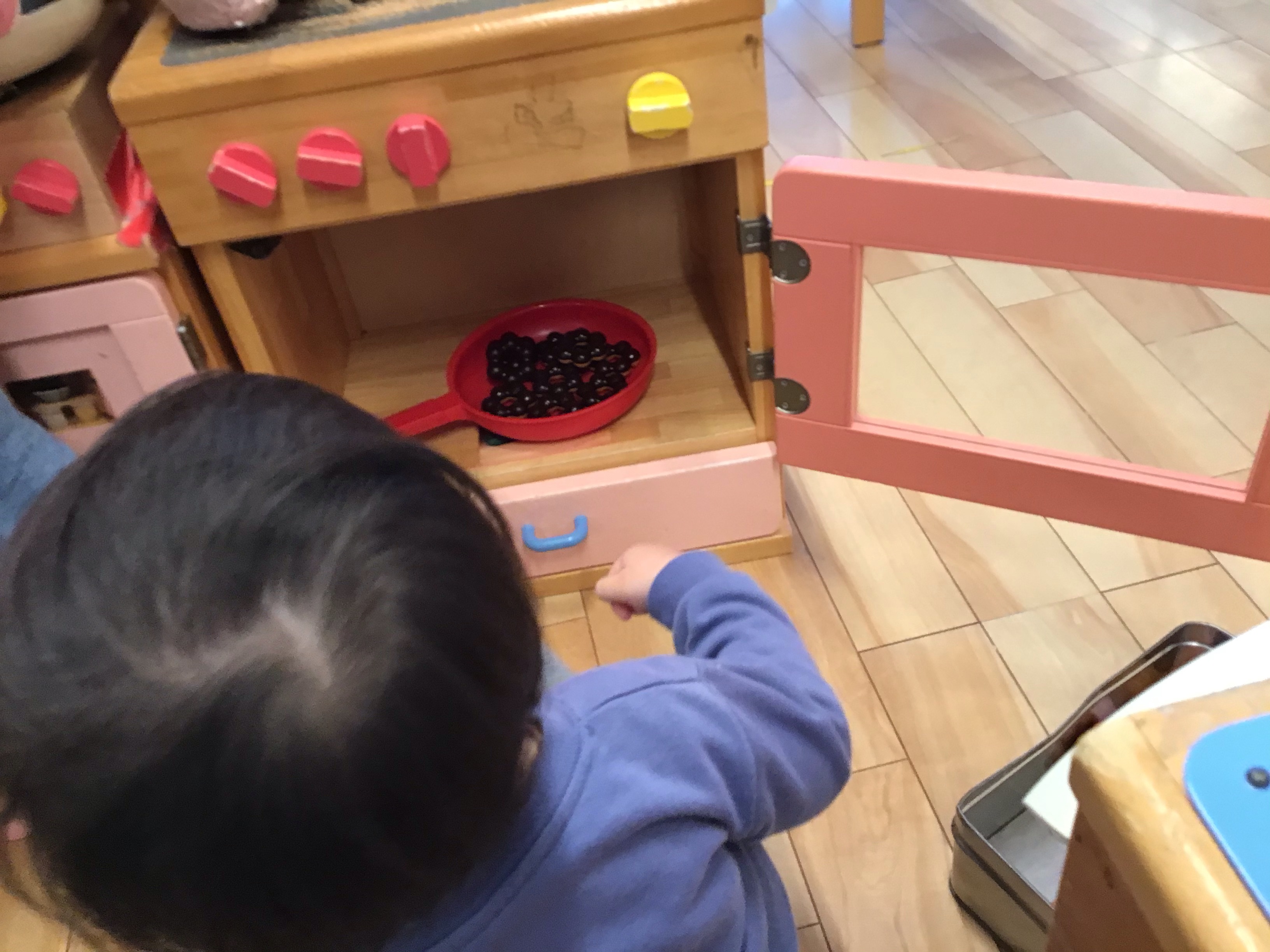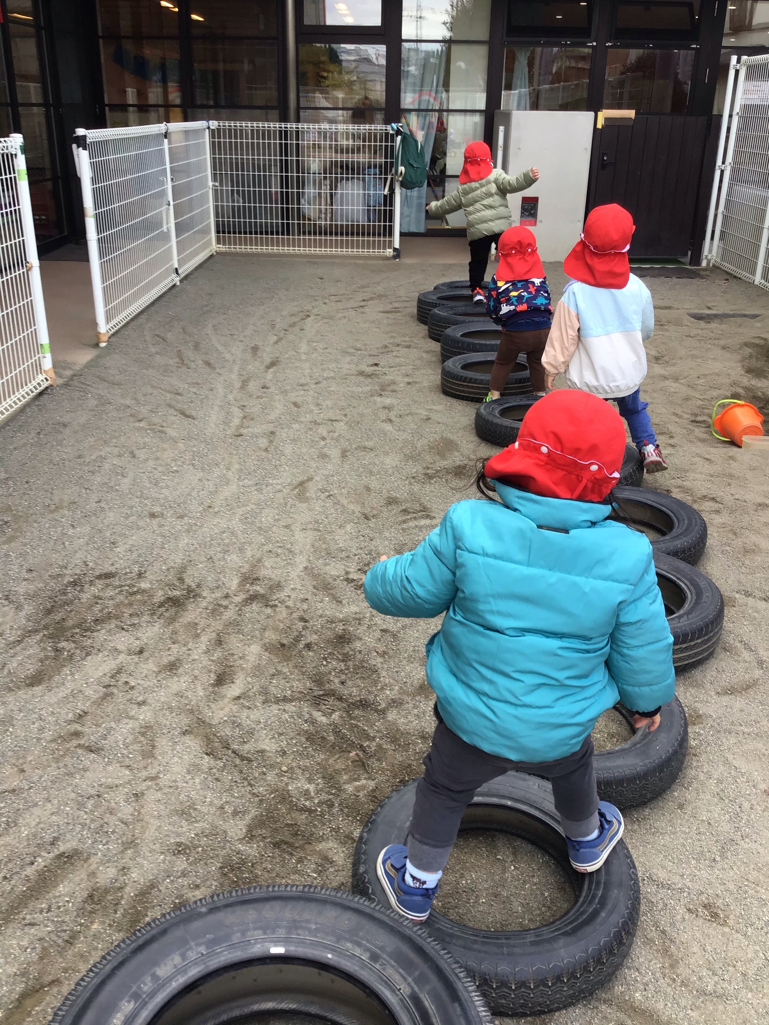 タイヤを並べて橋にみたてて、「ワニに食べられちゃう!落ちないようにしよう!」と渡ったり、大きなお家をつくり、その中でおままごとをしたりして遊ぶ姿が増えてきました。「〇〇屋さんに行きたいな」「サミットに海苔を買いに行こう」などなど可愛らしいお話を沢山聞く事ができます。寒い日も増えましたが,寒さに負けずに夕方も元気いっぱい遊んでいる子供達です。