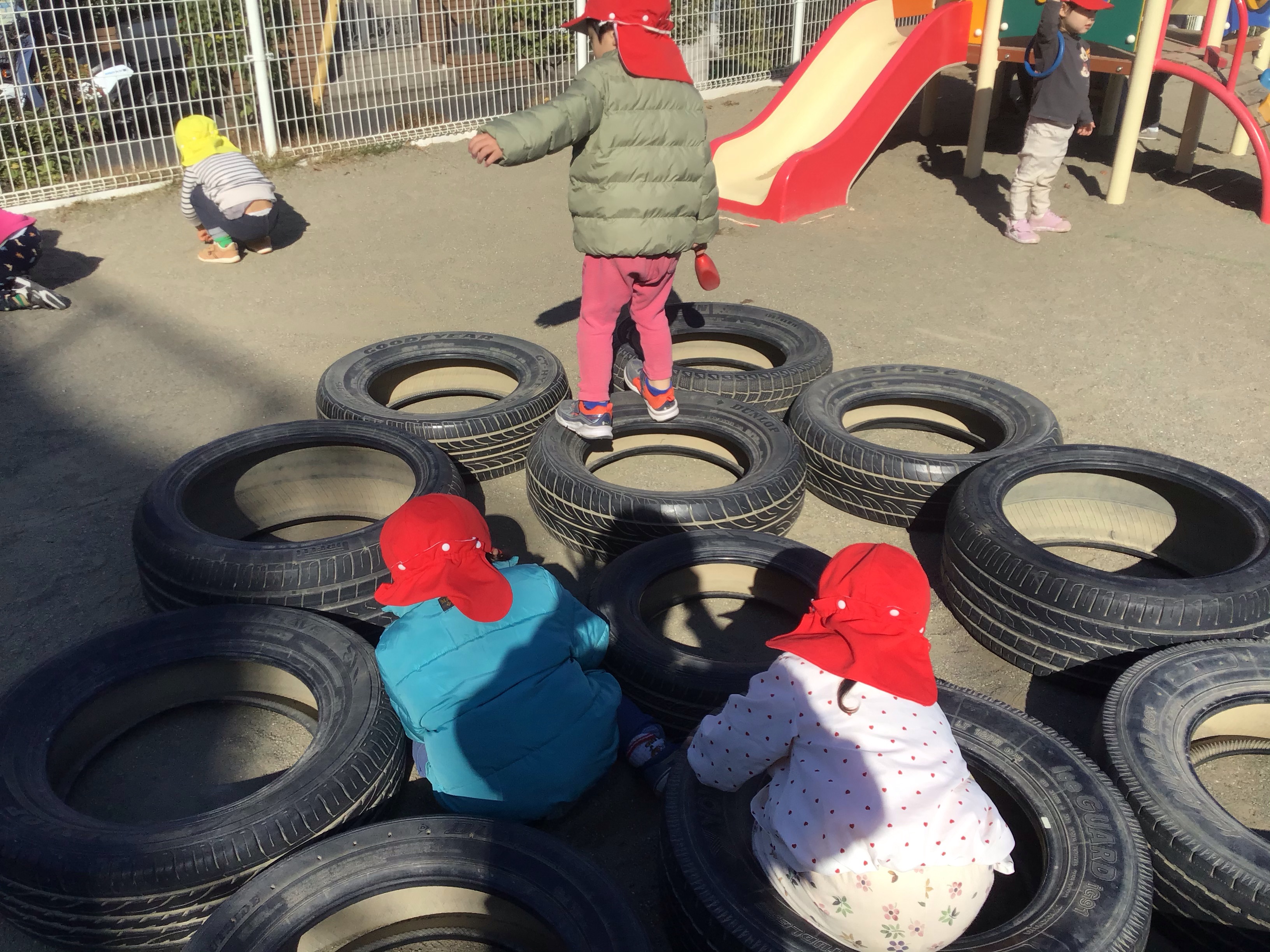 以前は一人一人がタイヤに入り「お家だよ」「お風呂作ったんだ」という事が多かったうみ組さん。今は遊びが一人で遊ぶことからみんなで遊びたい!という感じに変化してきています。