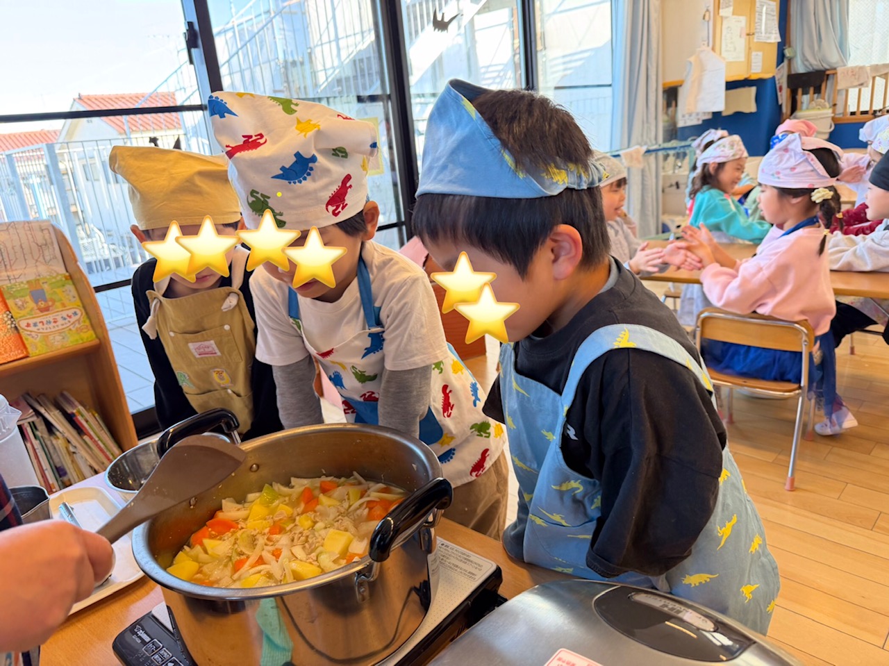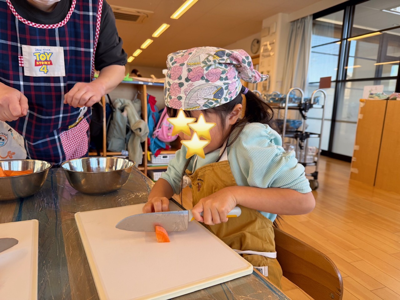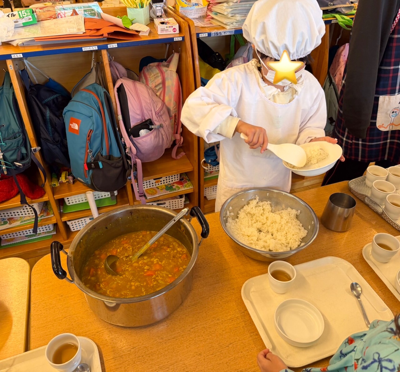 初めて包丁やピーラーを持った子もいましたが、しっかりと約束を守っておこない、最後には自分たちでカレーをよそって、おいしくいただきました。