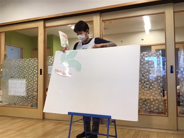 保育士からのお楽しみは「まあるいたまご」のスケッチブックシアターでした。