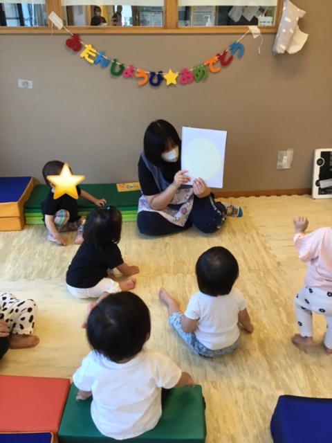 保育士からのプレゼントは「まあるいたまご」のスケッチブックシアターです! 色々な動物が出てきて、じっと見ていた子どもたち。最後にお誕生日ケーキがでてくると、みんなで食べてお祝いしました!
