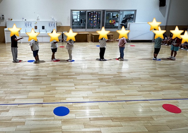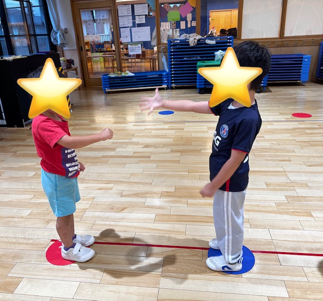 『勝ったら自分の乗っているマーカーの色の方に逃げる。負けた方は追いかけてタッチをする。』というルールで少し頭を使ったゲームをしました!