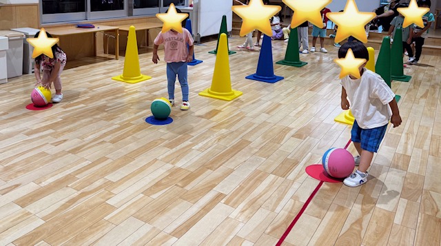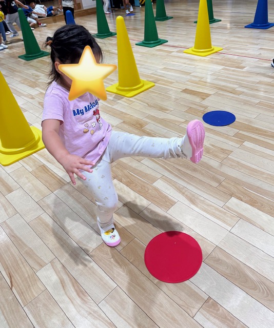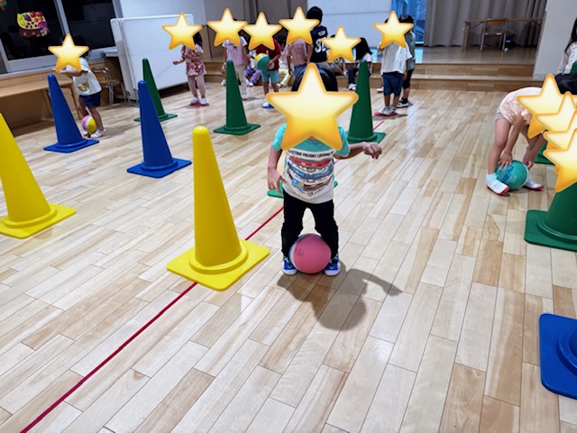 次はボールを手で持ったり、足でボールを挟んでジャンプしたりしながら、コーンをジグザグに抜けるシュートゲームをしました⚽️