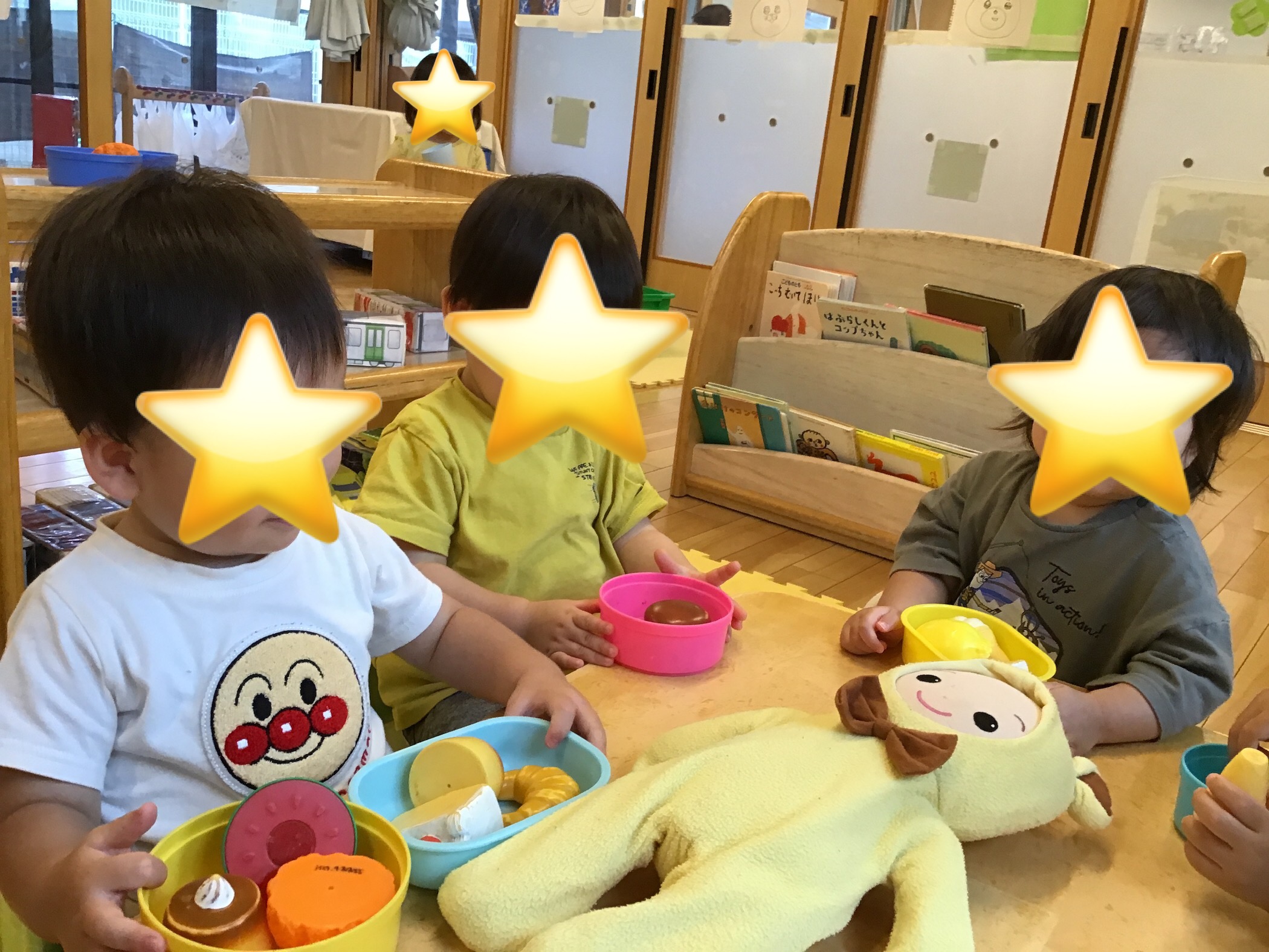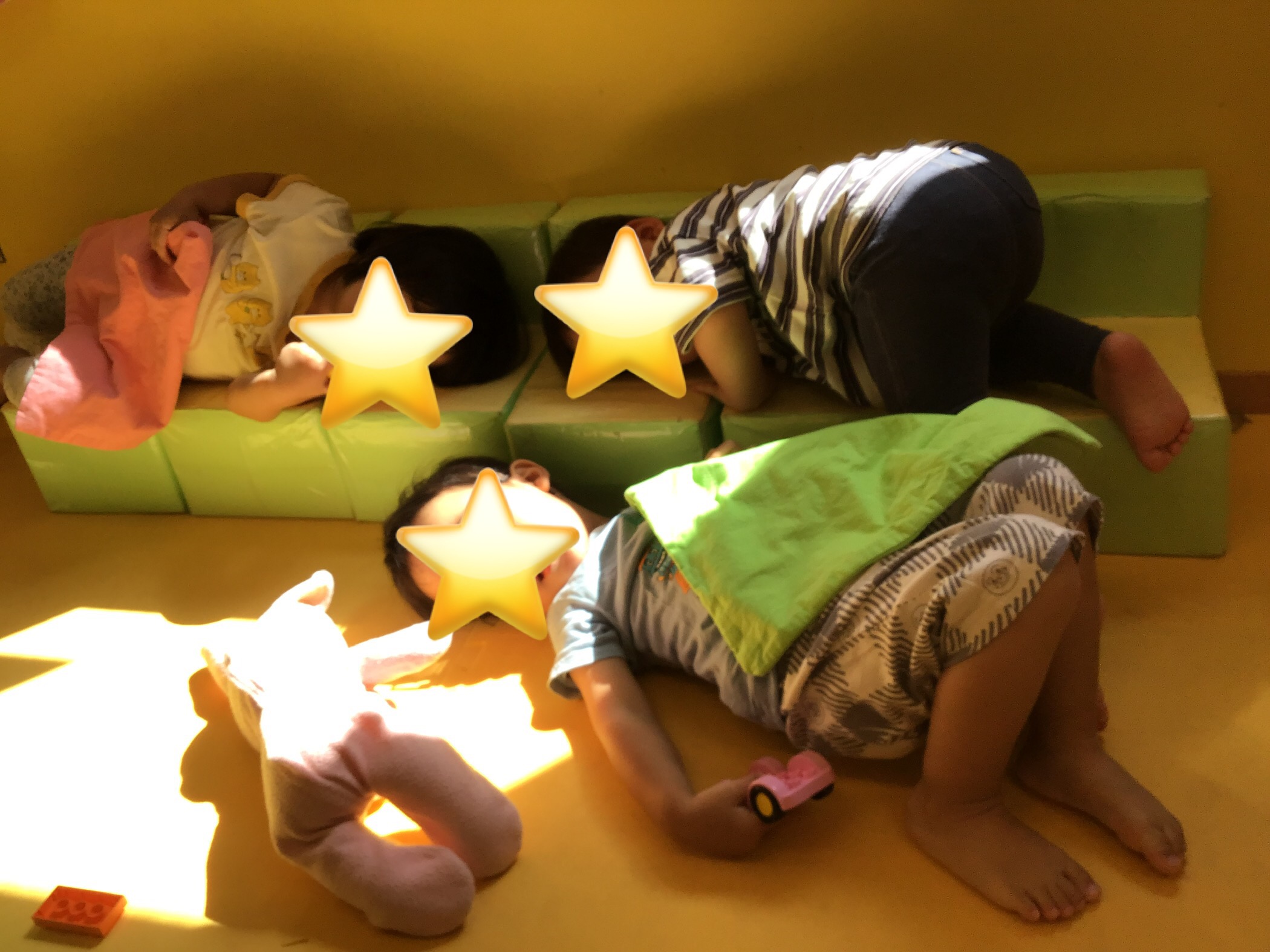 お部屋ではおままごとでのやりとりやごっこ遊びが具体的になってきました! お皿に上手に盛り付けしたり、お人形と一緒にゴロンと寝転がってお布団を掛けたりして楽しんでいます。