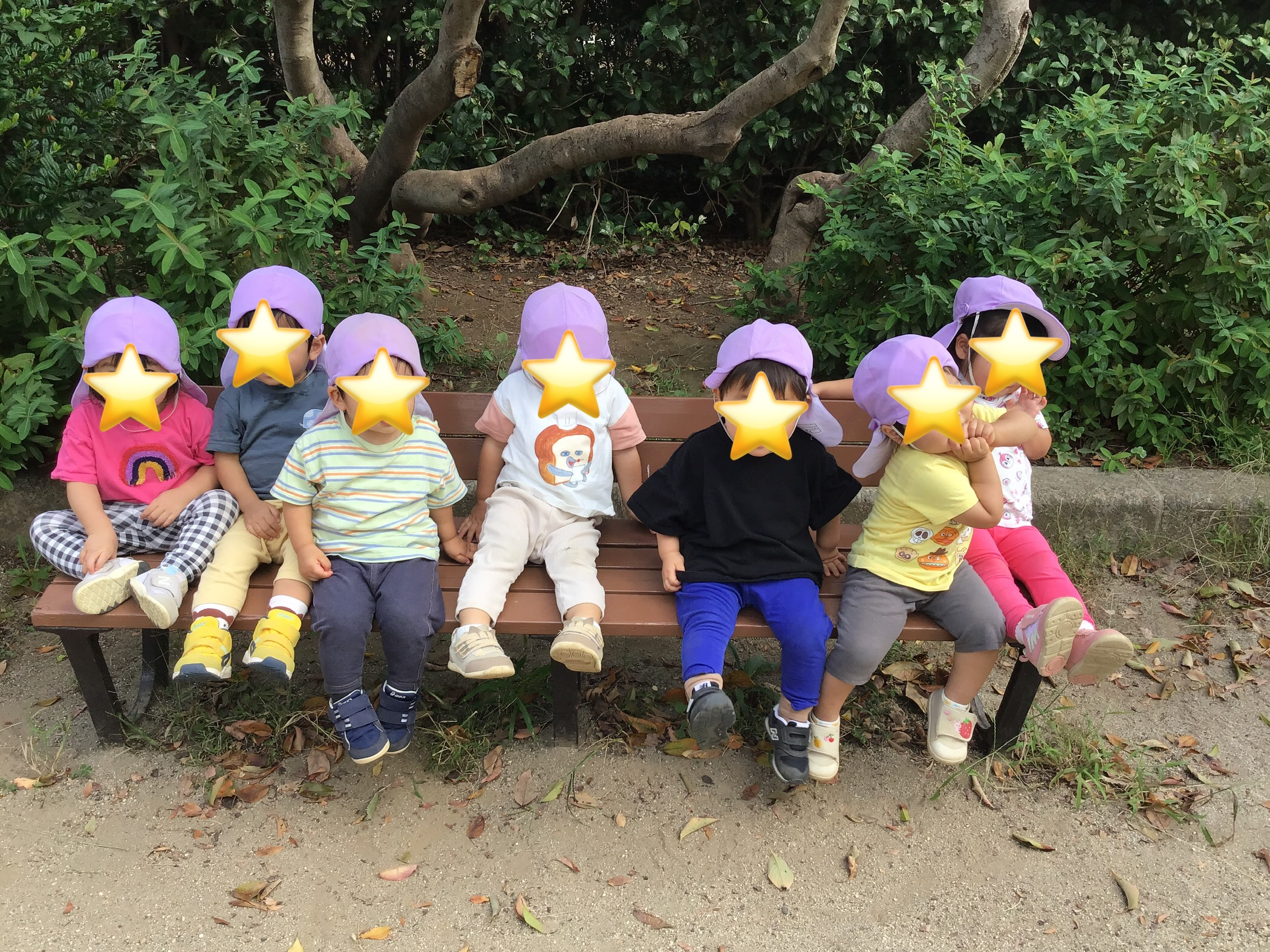 涼しくなってきたので1歳児クラス合同で公園にお散歩に行ってきました! ベンチを見つけるとみんな仲良く座ってニッコリ!笑顔が可愛らしかったです!