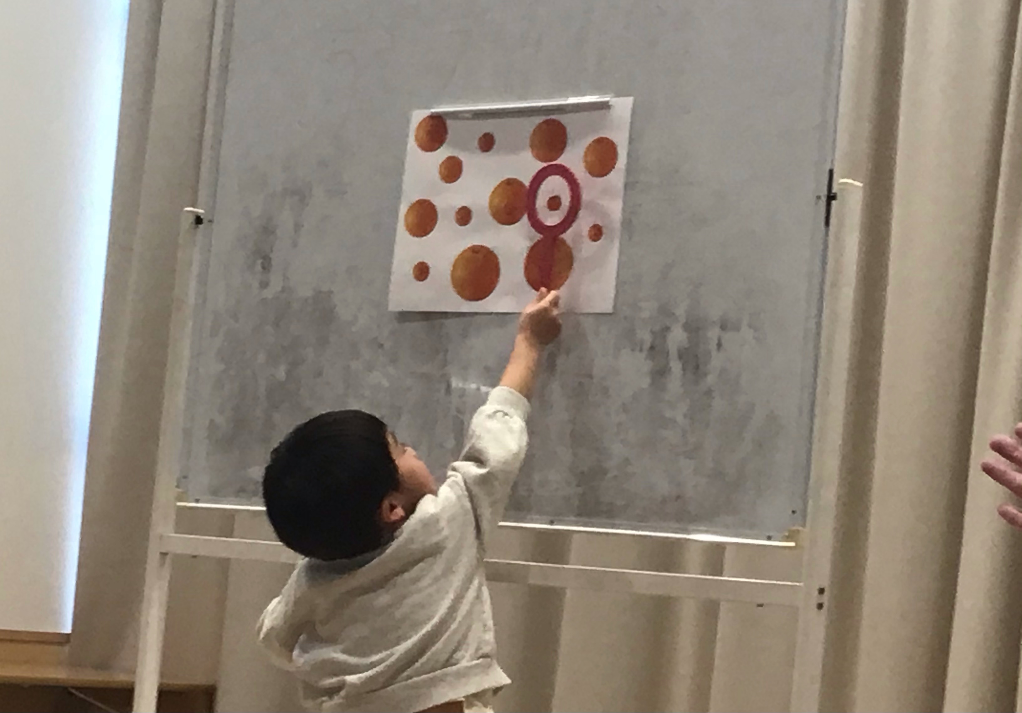 形や色が似ている写真をよく見て一つだけ違うものを当てるクイズで、分かると元気よく手をあげる姿がありました。