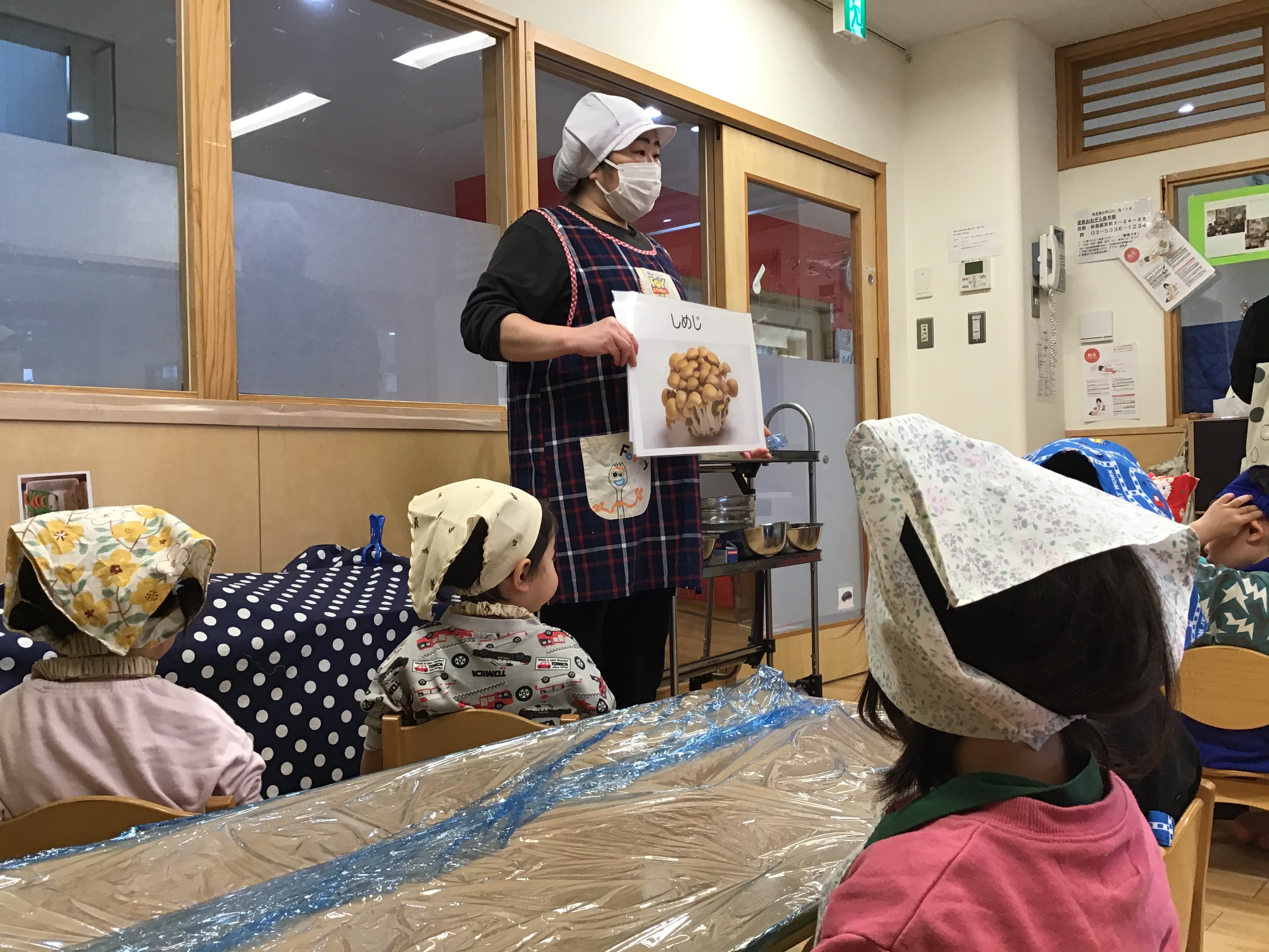 調理師の先生から最初にキノコの種類を教えてもらうと「食べたことある」「ママがよく買ってる」と様々なリアクションがありました。