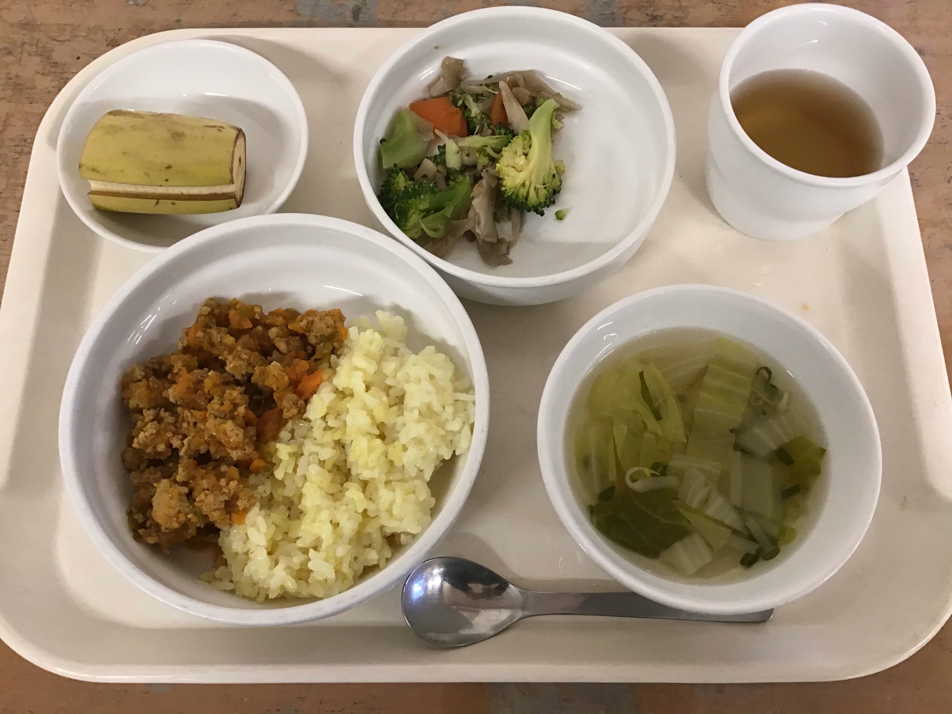 割いたキノコは給食のサラダに入っており、カレーと一緒に美味しくいただきました。