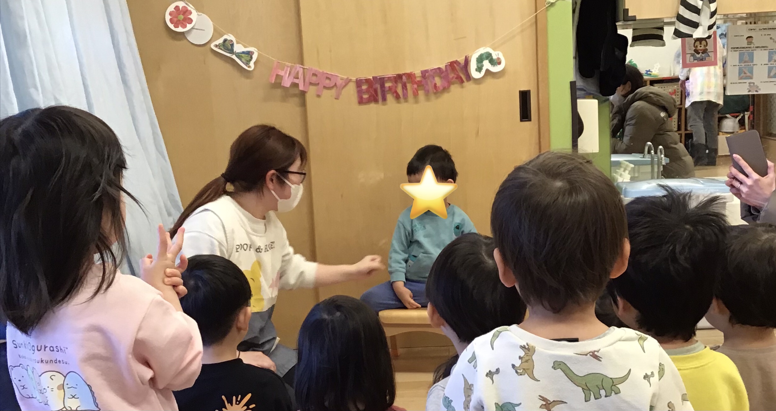 2月生まれのお友達のお誕生日会でした。 朝登園してから「今日は〇〇の誕生日会なんだ〜」と嬉しそうにお話していました。