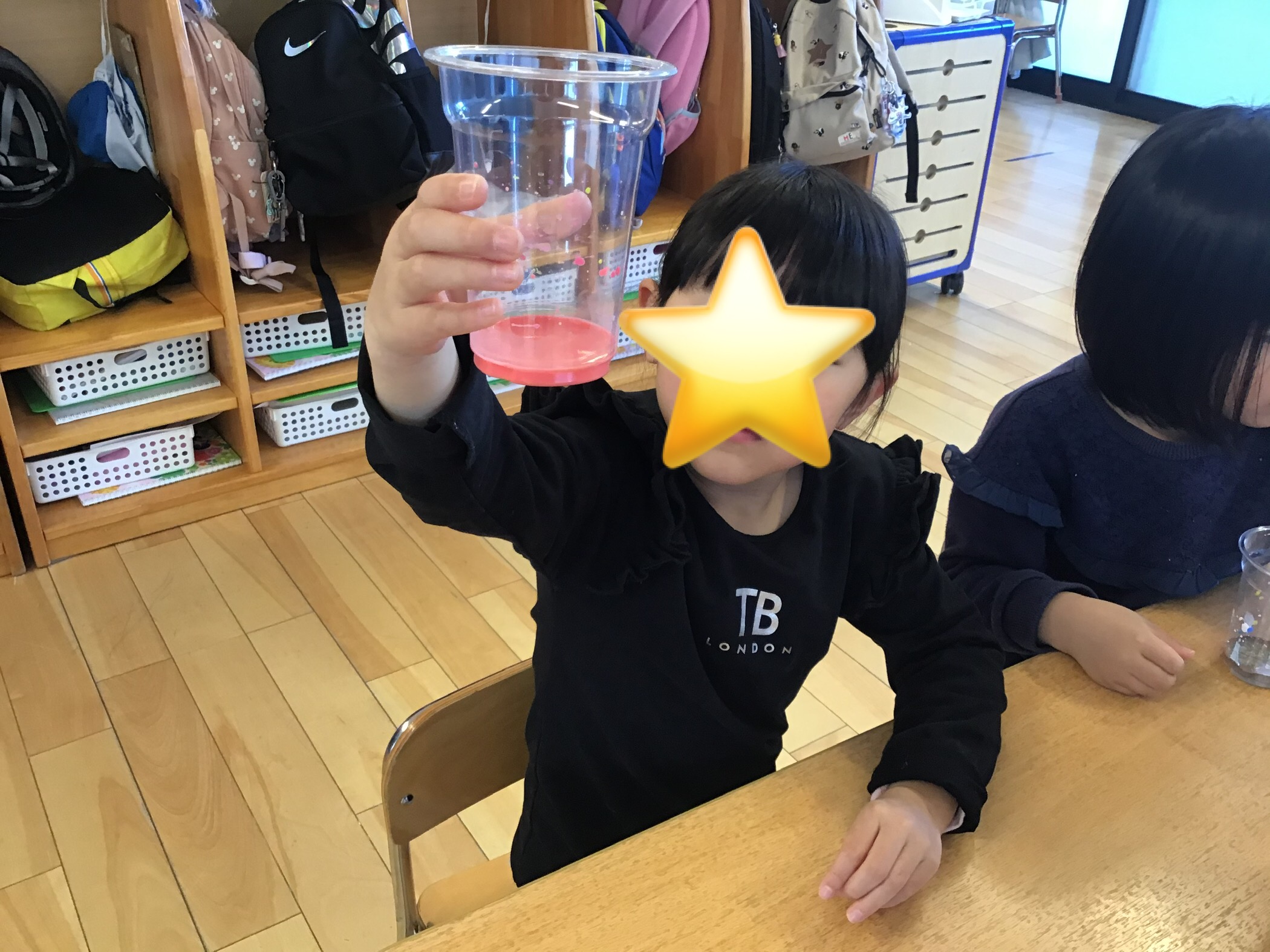 できた色を見て「レタスの色みたい!」等、食べ物や飲み物の色に例える姿やお気に入りの色ができて嬉しそうにする子どもたちでした。