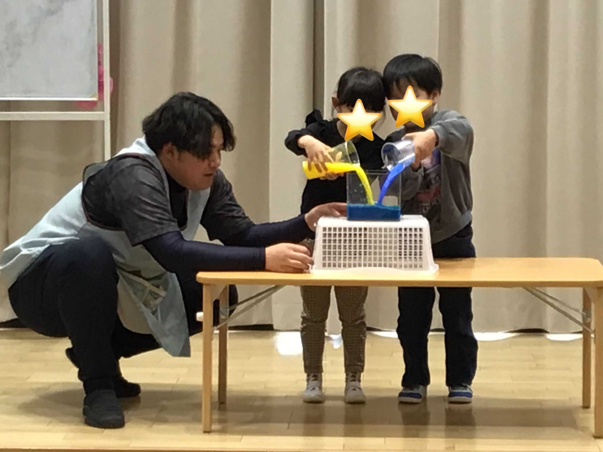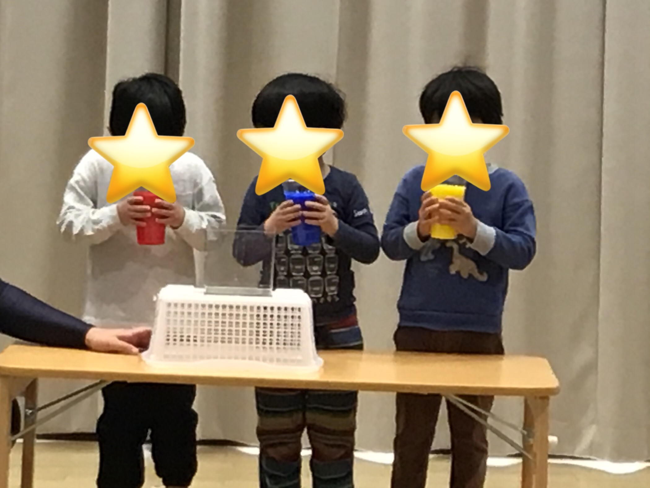 前回おこなった色水での色の組み合わせをクイズ形式で他クラスにひかり組でおこなってきたことを共有しました。