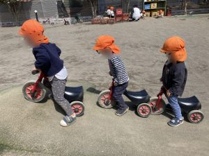 園庭では、ミニバイクやボール砂場など、好きな遊びをたっぷりと楽しんでいます。