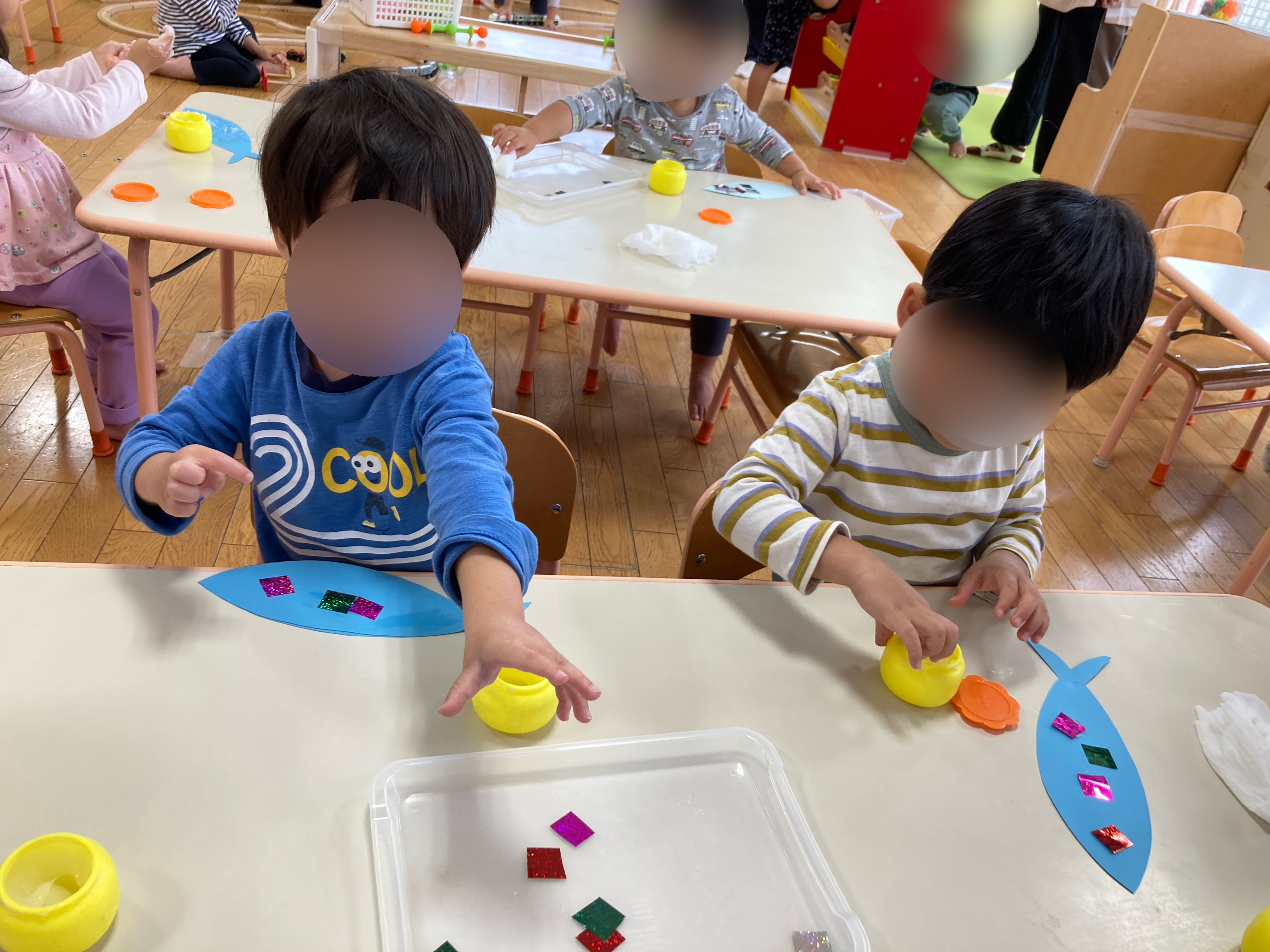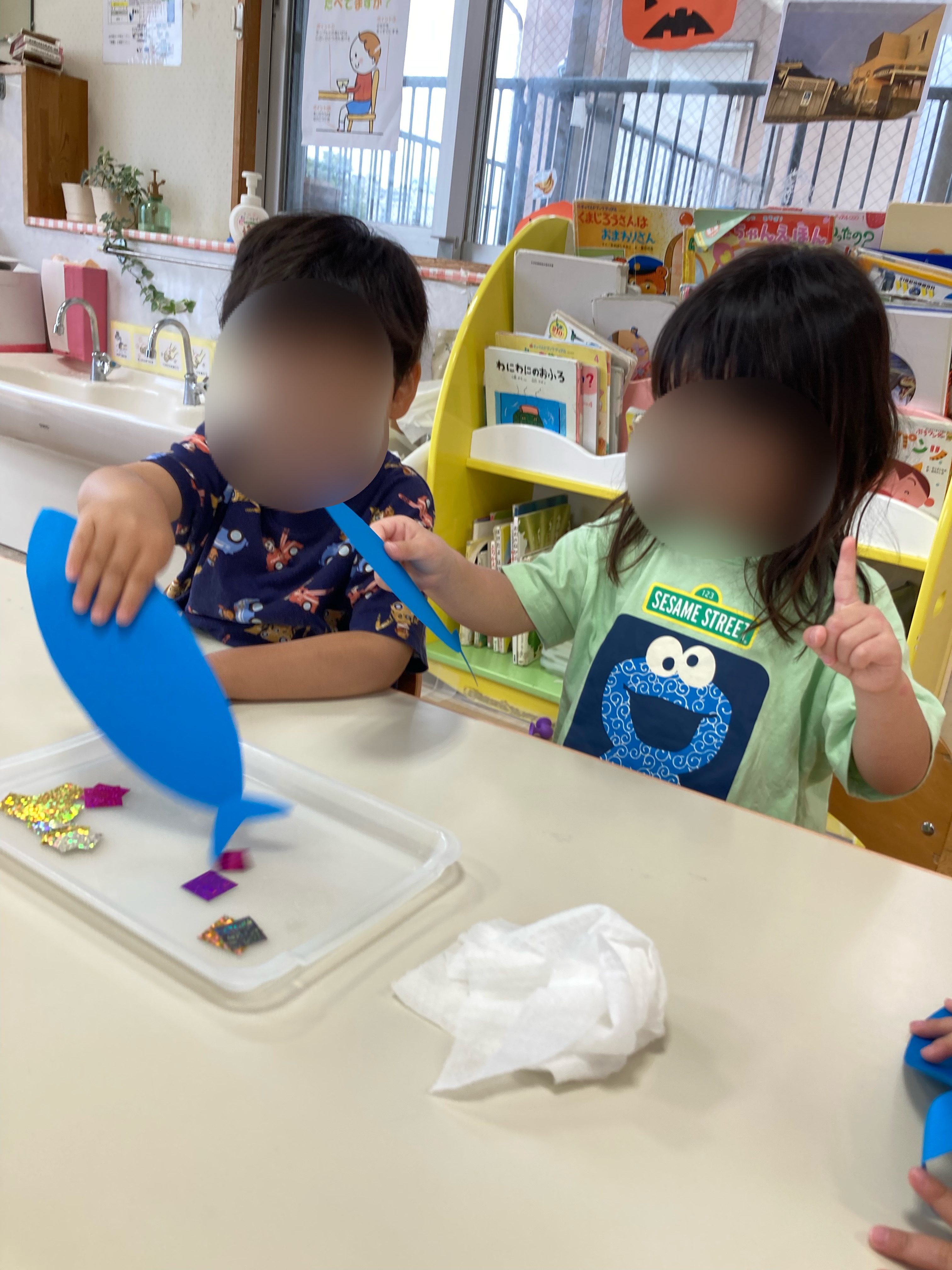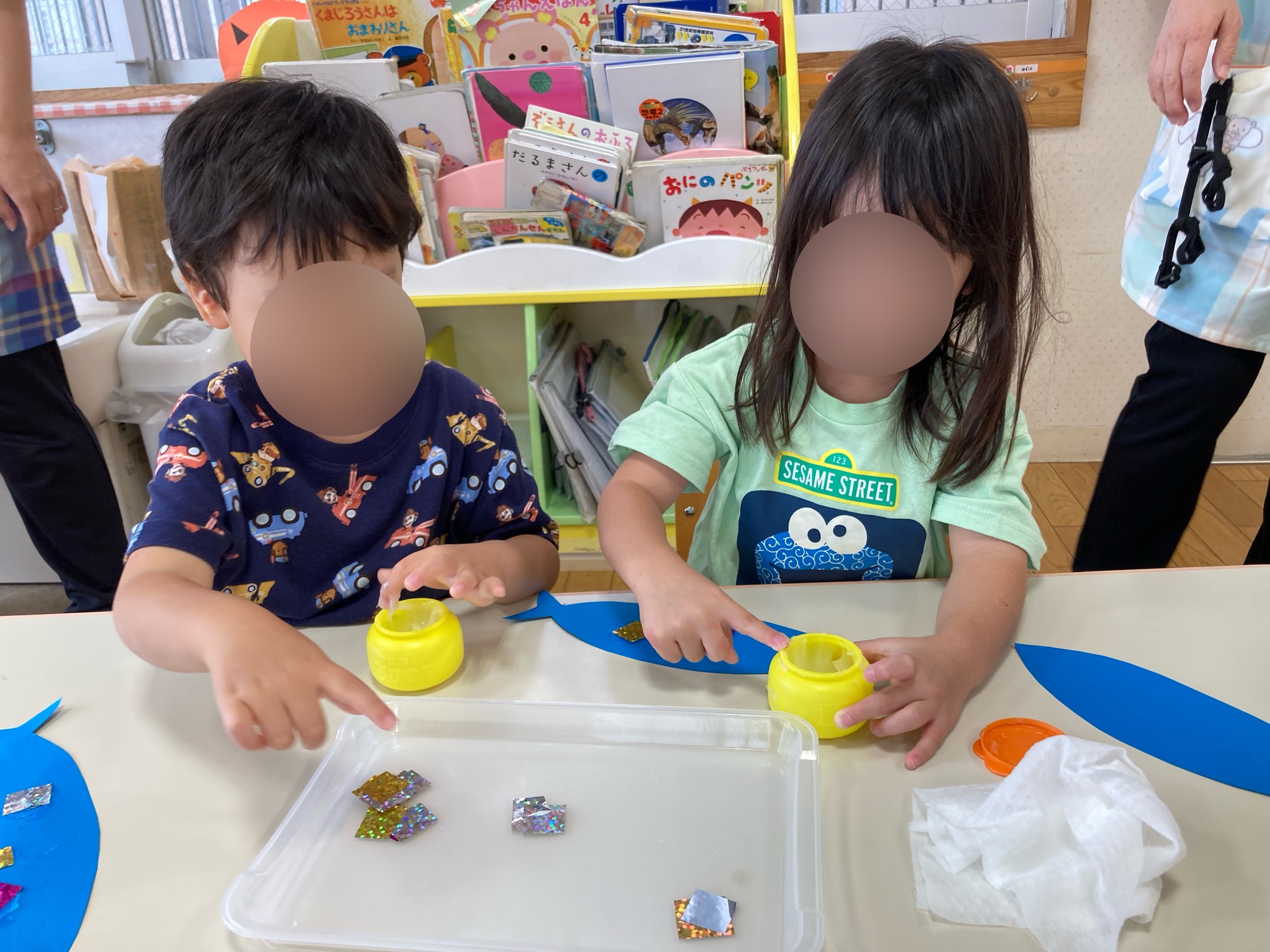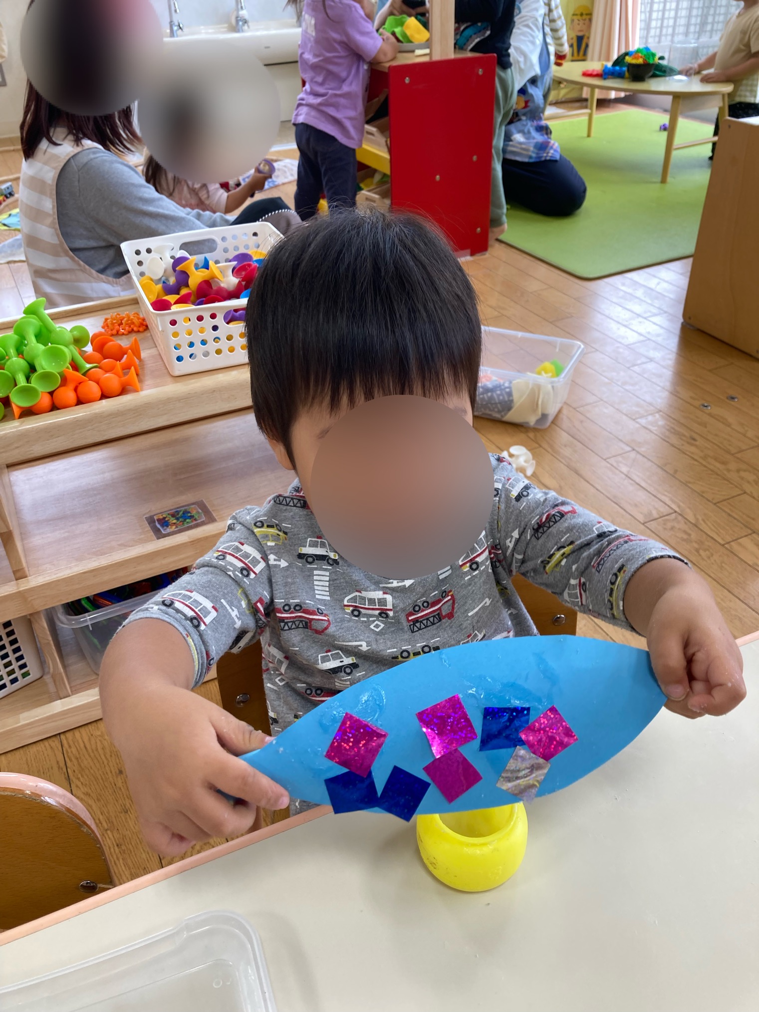 好きなだけキラキラ折り紙を貼れると「できた!」「いっぱい貼った!」と教えてくれた子どもたちです!