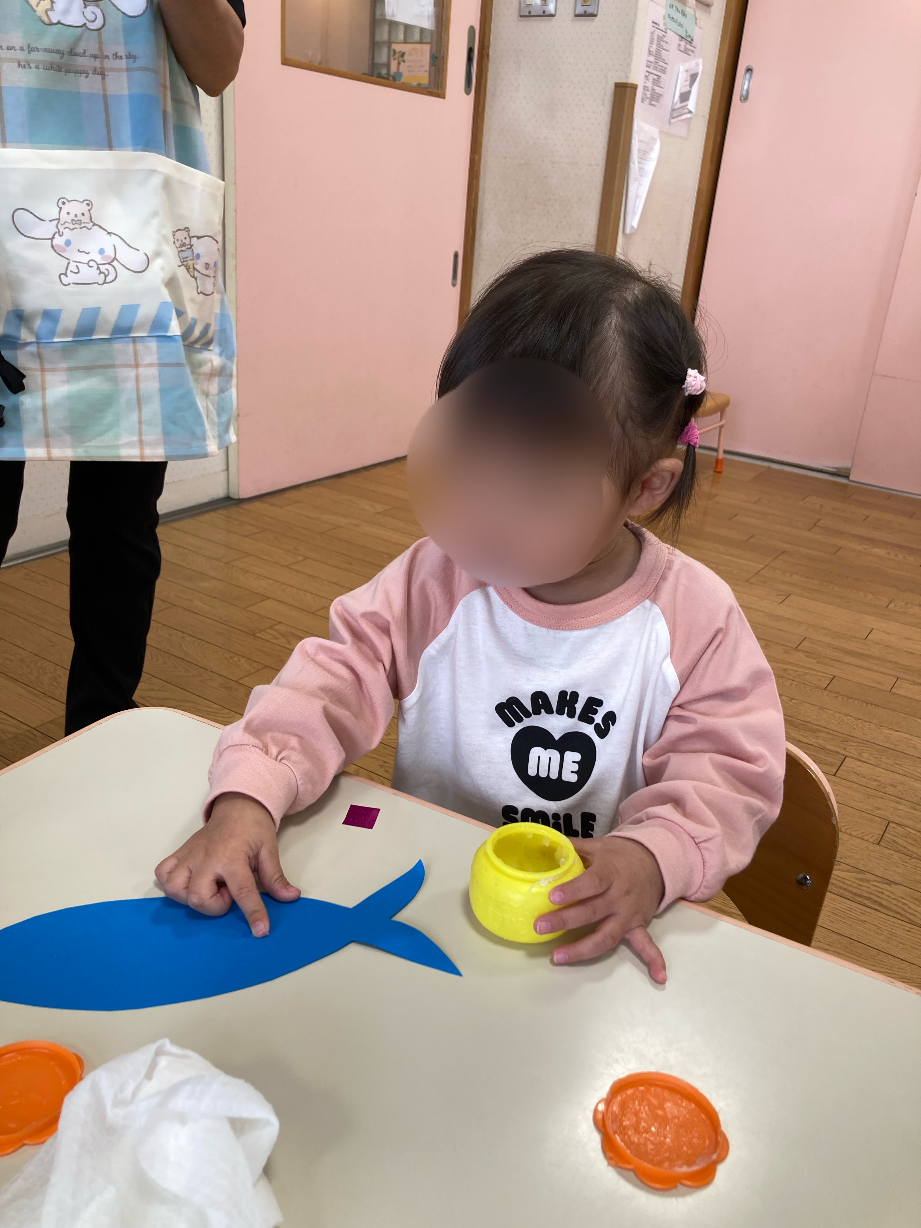 「1の指でぬりぬり〜」と伝えると「ぬりぬり〜」と呟きながら糊を塗り始めました!