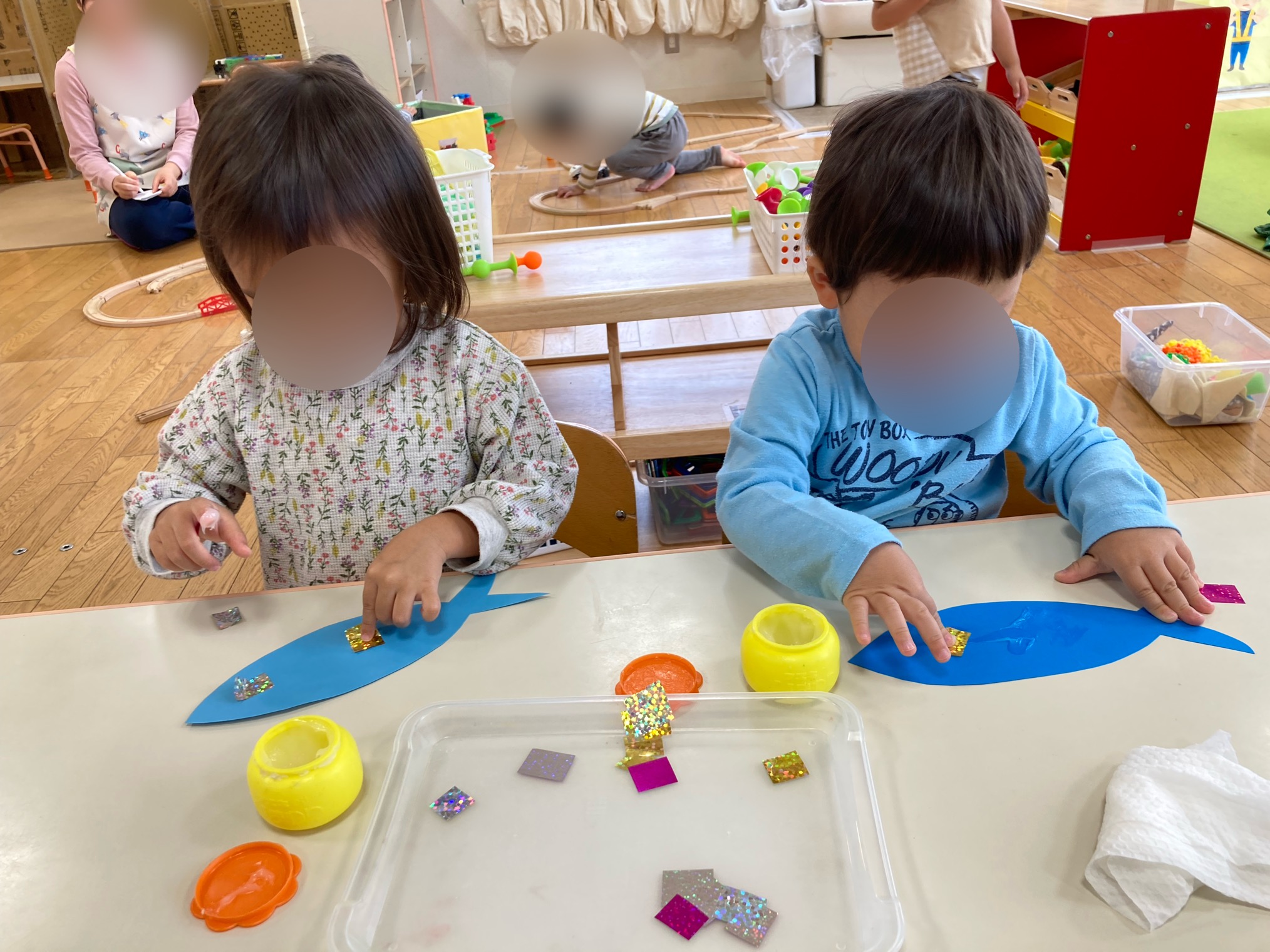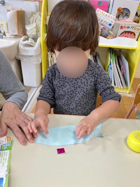 次にキラキラ折り紙を出して「キラキラ貼るよ」と伝えると「キラキラだぁ!」「青のキラキラがいい!」など話しながら喜んでいました。