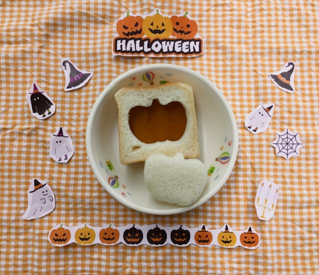食パンをかぼちゃの形に型抜きして、かぼちゃペーストを挟みました。