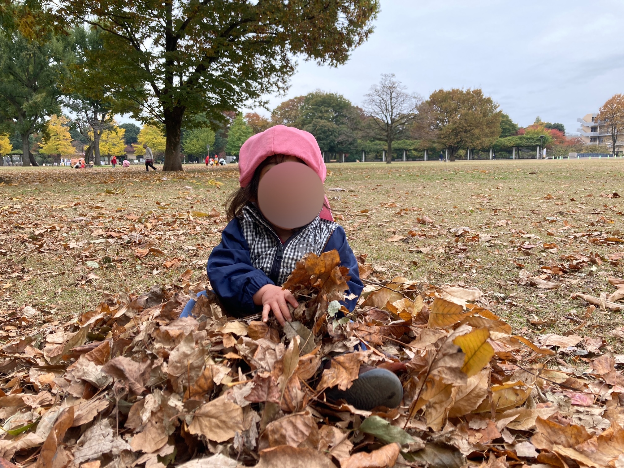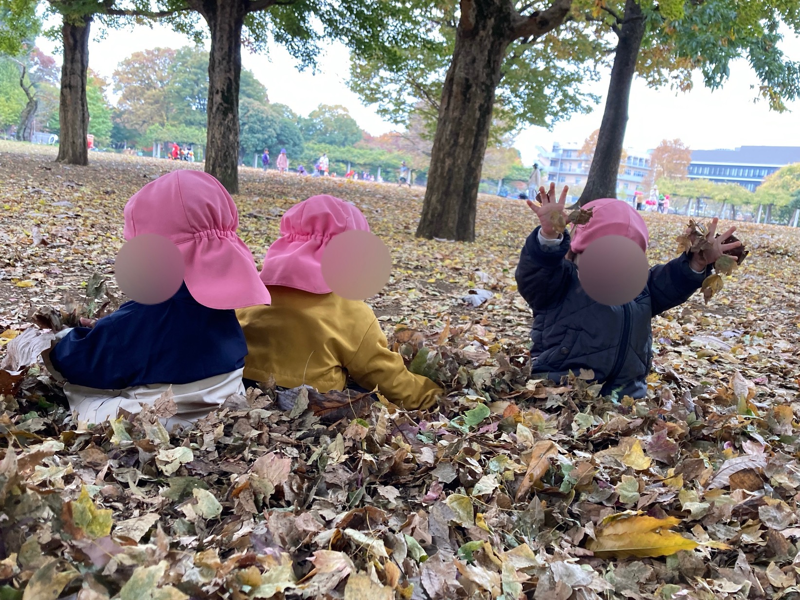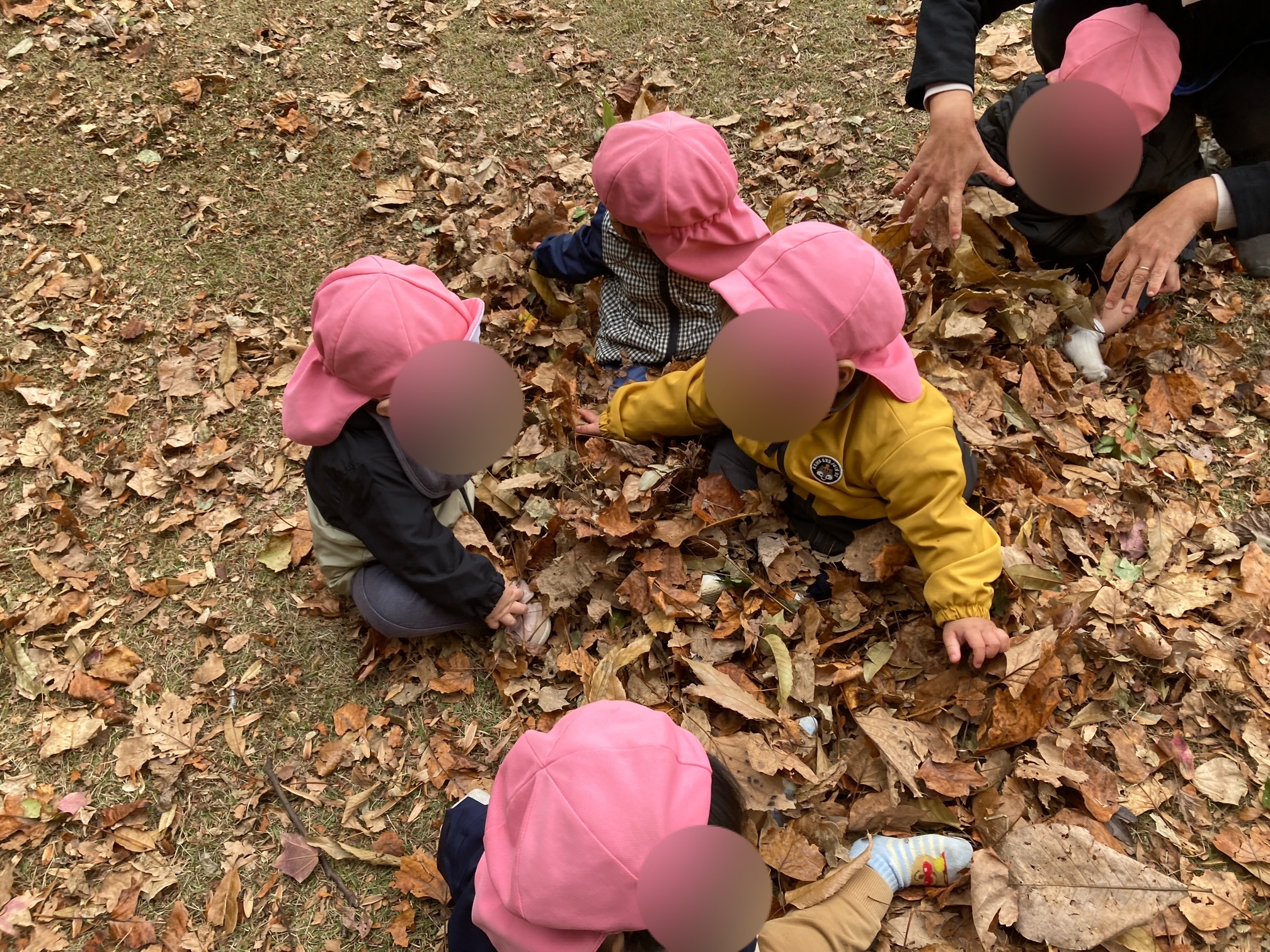 落ち葉をたくさん持ち上げて… ヒラヒラ〜! 保育士の真似をして落とす遊びも楽しんでいましたよ。