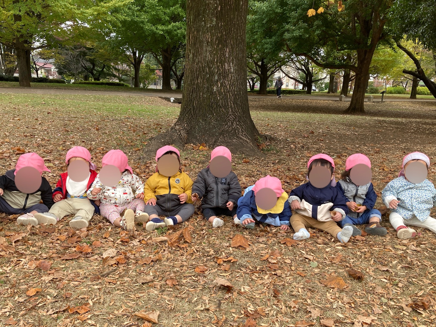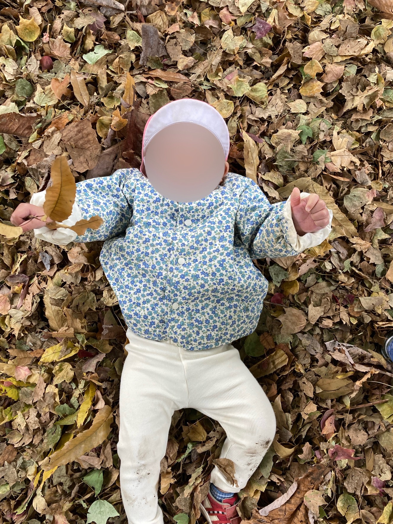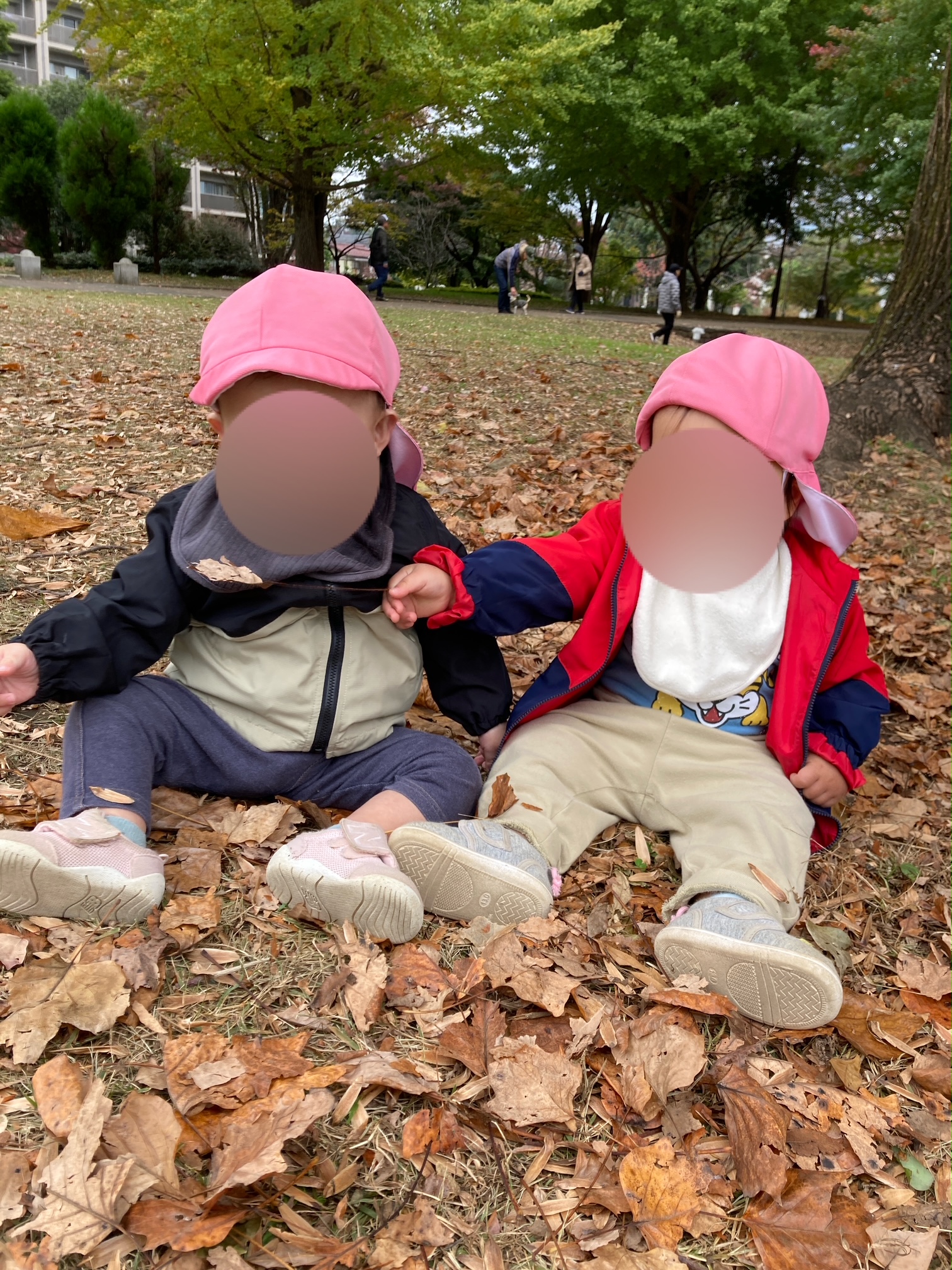 落ち葉をたくさん持ち上げて… ヒラヒラ〜! 保育士の真似をして落とす遊びも楽しんでいましたよ。