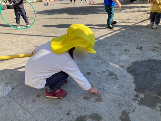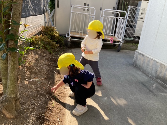 「おちば、あるかな?」と言いながら園庭を探索し始めるお友だち。しばらくすると「あった!」と落ち葉を見つけました。