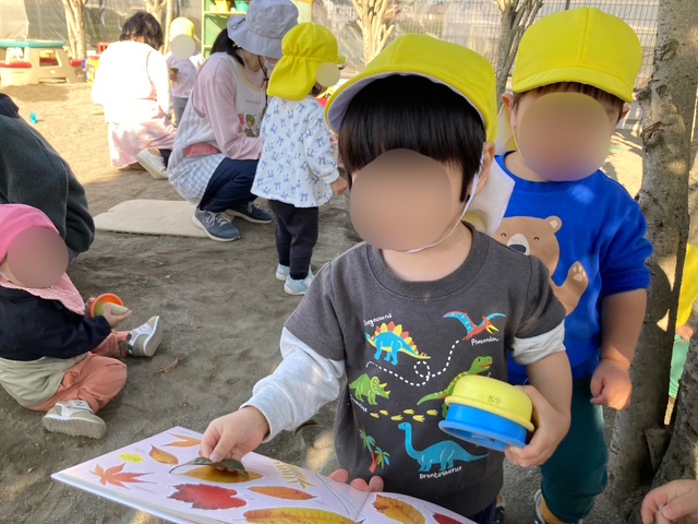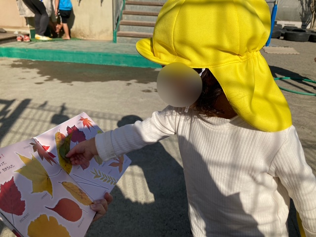 「ほん、みてみよ」と言って絵本の中の写真と落ち葉を比べていましたよ。