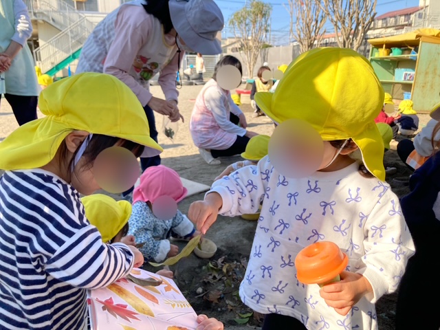 今日は絵本を見ながら、園庭で落ち葉探しをしました。
