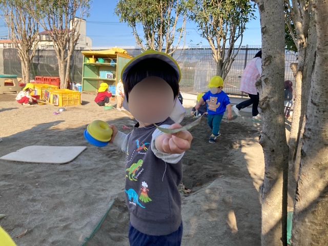 落ち葉を見つけて袋に入れているお友だちいて、「いっぱい!」と落ち葉をお友だちや保育士に紹介してくれました。