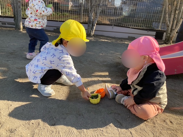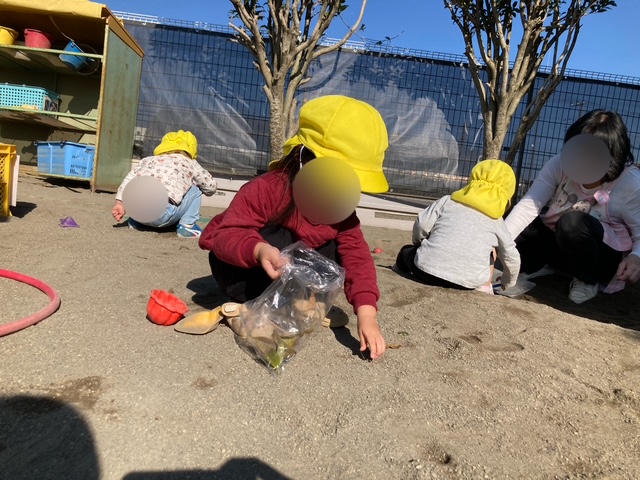 落ち葉をご飯に見立てて遊んでいるお友だちもいて、とても可愛らしいひと場面でした。