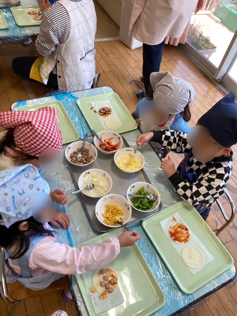 各テーブルに具材が配られると、「わぁ〜チーズいっぱい!」「〇〇ちゃんコーン入れたい!」と前のめりになって目を輝かせていました。