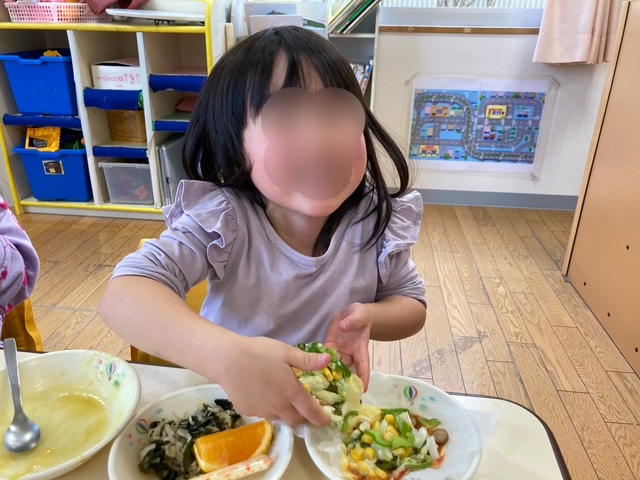 具材をたくさん乗せたので、上手に折って食べるお友達も!