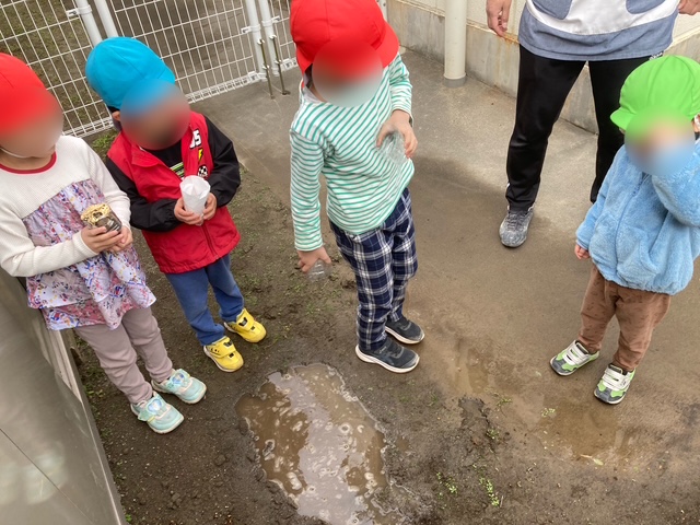 雨が降っていた為、園庭に水溜りを発見しました。泥水になっていた為、濾過実験を行うことにしました。