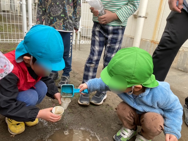 まずは泥水を集めます。異年齢で協力して、少しずつ集めていました。