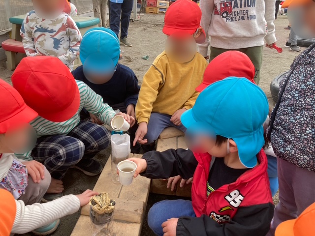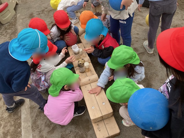 「少しずつ泥がポタポタ落ちてくるかな?」と予想している中、「コーヒーみたい!ママがやってるよ!」「何するの?実験?楽しそう〜」と、どんどん子ども達が集まってきました。